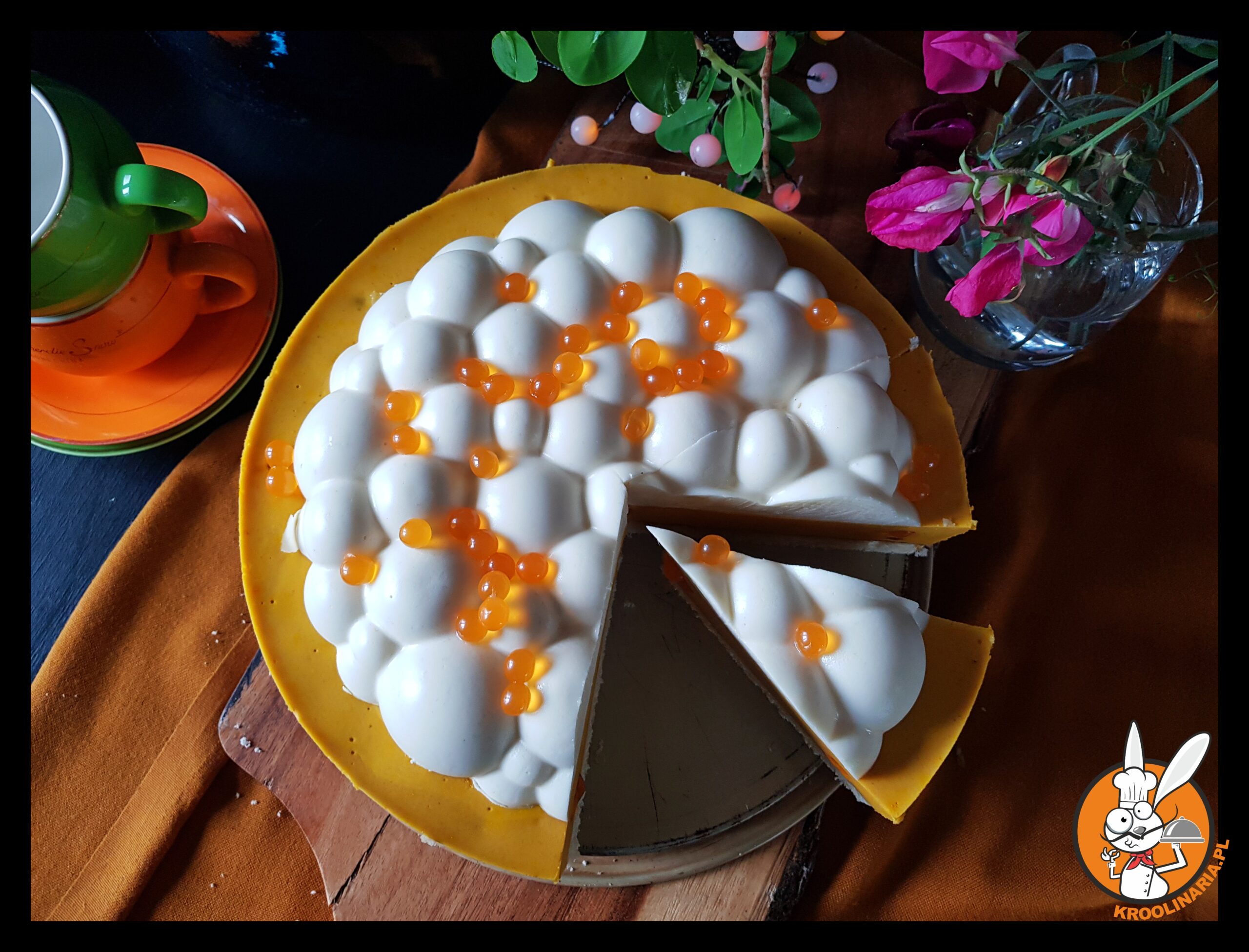 Teraz, to już Konefka powymyślała z tym ciastem, że hej. Biszkopt, na to delikatna pianka mango z dodatkiem magicznych kuleczek popping boba, czyli kuleczek z delikatnej osłonki wypełnionych sokiem mango. Na wierzch sernik na zimno, jako dopełnienie rozpusty.
