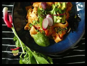 Makaron z sosem pomidorowym i wędzonym łososiem. Sos pomidorowy robiony ze świeżych, dojrzałych, pachnących pomidorków winnych duszonych z czosnkiem i przyprawami. Przed podaniem zblendowany na