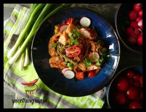 Makaron ryżowy z warzywami i łososiem. Taki obiad na szybko, ale niezwykle kolorowy i smaczny. Makaron połączony z sosem sojowym i podsmażony z brokułem, pomidorkami