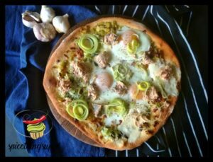 Pizza z jajem, porem i łososiem. Pizza domowej roboty z sosem porowo smietanowym, mozarella, łososiem i lekko scietymi jajkami. To połaczenie jest naprawdę pyszne
