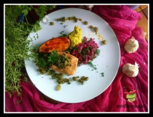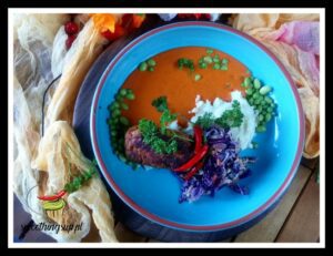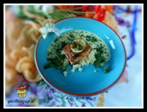 Groszkowe kopytka z piersią z kurczaka. Danie pod tytułem „Zielono mi”. Obłędnie zielone kopytka z zielonego groszku podane z groszkiem i fasolą soi przesmażoną na maśle z czosnkiem. Do tego pierś z kurczaka.
