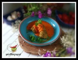 Gołąbki w sosie pomidorowym. Gołąbki nadziane białą kaszą gryczaną, podsmażoną cebulką i mięsem mielonym. Do tego sos pomidorowy zrobiony ze świeżych pomidorków koktajlowych duszonych na patelni, a potem zblendowanych i wymieszanych ze śmietaną. Intensywnie pomidorowy, gęsty i aromatyczny. Gołąbki pod koniec duszone w sosie dla bardziej wyrazistego smaku.