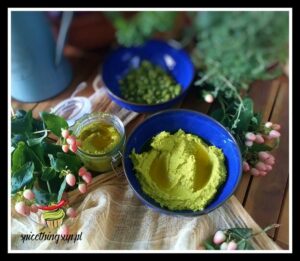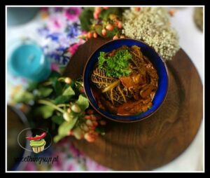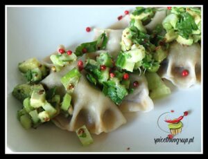 Pierogi z soczewicą. Kiedyś robiłam pastę z soczewicy na kanapki. Tak mi zasmakowała, że stwierdziłam, że świetnie też się sprawdzi jako nadzienie do pierogów. Nadzienie do pierogów to soczewica, cukinia, suszone pomidory, przyprawa curry. Ja dodatkowo dałam też do smaku pastę tagine. Można zastąpić pomidorowym koncentratem. Nadzienie jest wyraziste w smaku i pyszne.