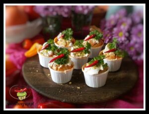 Muffinki z papryką. Wytrawne muffiny z dodatkiem parmezanu i ziół prowansalskich nadziane papryką. Przed podaniem posmarowane kremowym serkiem i posypane pokruszonymi pistacjami. Fajna przekąska do pracy jak i pomysł na śniadanie.
