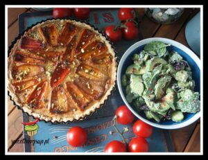 Quiche z papryką i kozim serem. Kruche ciasto wypełnione nadzieniem z koziego sera, jajek i śmietanki i wykończone karmelizowanymi paprykami. Świetnie nadaje się na przekąskę