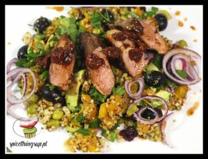 Sałatka z bobem podana z piersią z kaczki. Zdrowa i jednocześnie bardzo smaczna sałatka z komosy ryżowej z dodatkiem dyni, bobu, awokado oliwek i suszonej