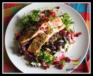 Łosoś z sałatką z buraka z sosem z sera pleśniowego. Pyszna ryba podana z sałatka z pieczonego buraka, chrupiącego selera naciowego, rzodkiewki, jabłka i ziaren