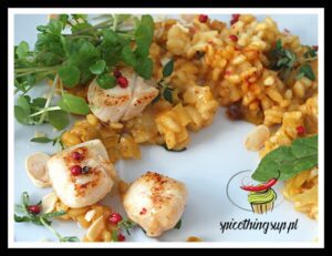 Risotto z porem, gruszką i przegrzebkami/Risotto with leek, pear, and scallops