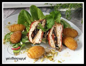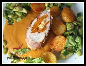 Pierś z kury nadziewana dynią i serem feta. Pierś bardzo dobrze smakuje z dynią. Ser feta zaostrza smak delikatnej dyni. Całość podana z kremowym dyniowym