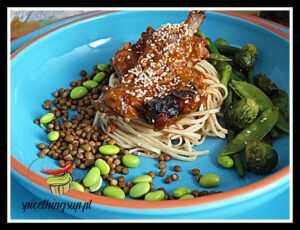 Żeberka w sosie miodowo sojowym z sezamem. Pyszne żeberka obklejone marynatą z sosu sojowego i miodu z dodatkiem sezamu. Aromatyczne, klejące, pachnące czosnkiem. U mnie
