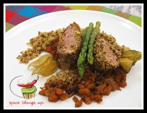 Polędwica wieprzowa z dyniowym chutney i komosą ryżową to wyśmienity sposób na przemianę zwykłego dania w wykwintną potrawę. Kwaskowo- słodki chutney podkreśla smak mięsa. Całość