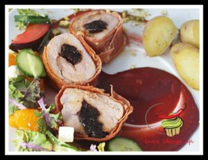 Polędwica wieprzowa nadziewana śliwką suszoną, owinięta w szynkę parmeńską. Polędwiczki podawane z aromatycznym sosem śliwkowym na bazie wina. Sos wykończony powidłami śliwkowymi, dodaje wyrazu. Całość