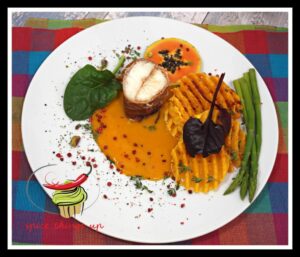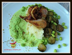 Schab w aksamitnym, porowym sosie z dodatkiem aromatycznych, chrupiących, pieczonych ziemniaków. Całość podana z duszonymi listkami brukselek.