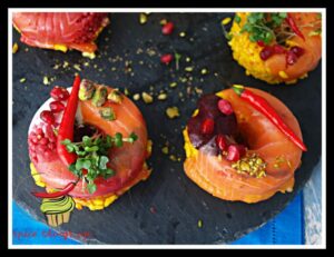 Wędzony łosoś z fetą, pistacjami i awokado w donutowej foremce. Smaczna propozycja na śniadanie. Wędzony łosoś z serem feta wzbogaconym smakiem pokruszonych pistacji oraz awokado.