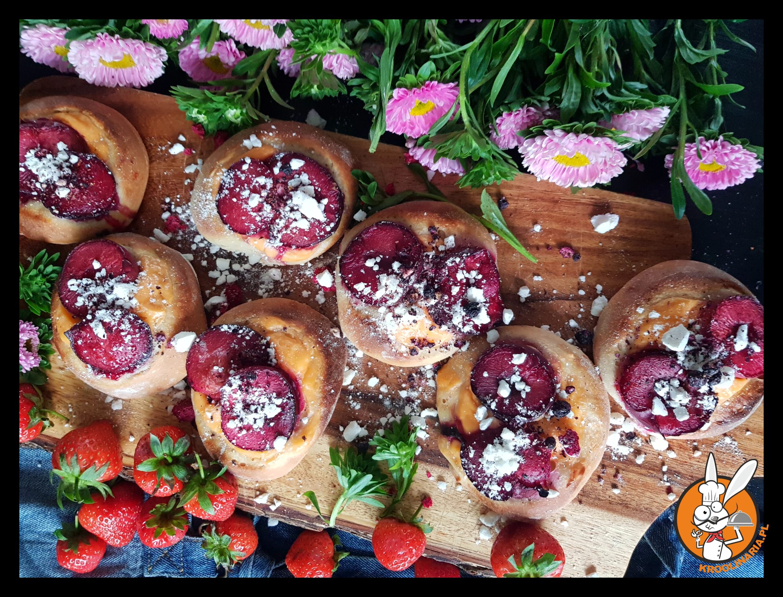 - Wyrośnięte ciasto umieścić na oprószonym blacie. Lekko wyrobić, rozwałkowac i podzielić na 18 równych części. Bułeczki układać na blaszkach, w dużych odstępach.Następnie szklanką z niedużym dnem zrobić w każdej bułeczce mocne wgłębienie, prawie do samej blachy, nałożyć do niego sera. Przykryć ręczniczkiem kuchennym, odstawić na około 40 minut do ponownego wyrośnięcia ciasta. Po upływie tego czasu nałożyć śliwki. Ciasto posmarować jajkiem roztrzepanym z 1 łyżką mleka.