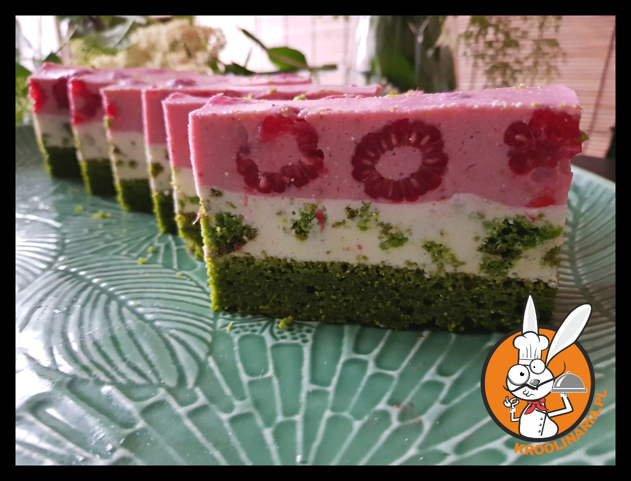 Króliś poleca, bo ta menda wszystko, co słodkie poleca. Zresztą, co tu nie polecać? Mamy wilgotny, szpinakowy spód, na to mamy warstwę serowo jogurtową połączoną z pokruszonym ciastem i na to obłędna, kwaskowa warstwa musu malinowego wymieszana z malinami