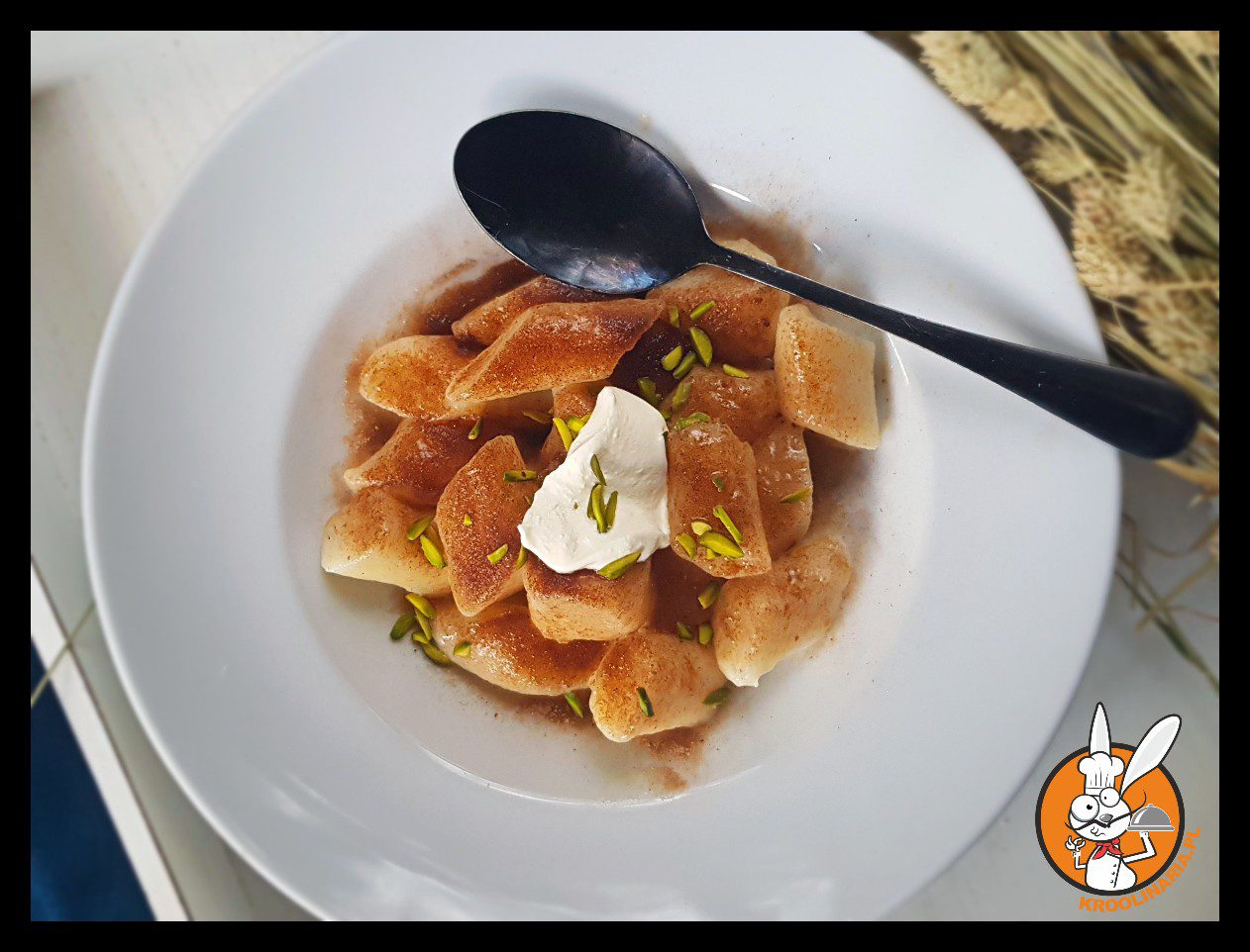 - Kopytka polać roztopionym masłem i obtoczyć w mieszance drobnego cukru i cynamonu. Można posypać pistacjami