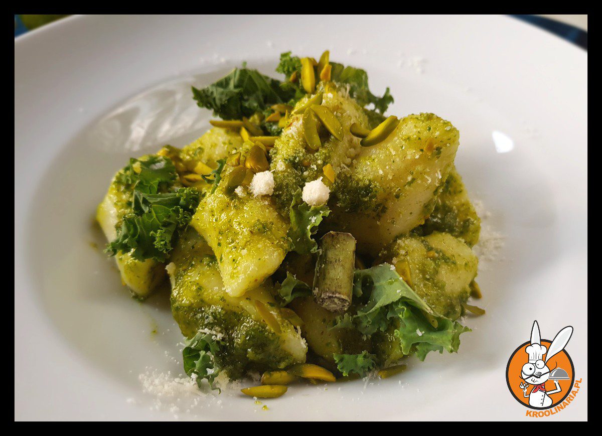 - Ciepłe kopytka wymieszać z pesto i przed podaniem posypać parmezanem