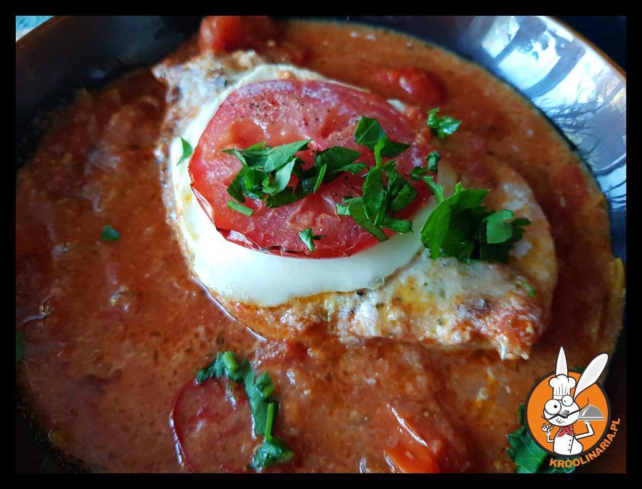 - Pierś natrzeć ziołami, posolić i popieprzyć. Obtoczyć w mące i smażyć z obu stron na rozgrzanym oleju na lekko złoty kolor. Wyłożyć na talerz. Na wystudzone położyć plaster mozzarelli i plaster pomidora. Tak przygotowane piersi umiescić we wczesniej przygotowanym sosie i wstawić do piekarnika nagrzanego do 180 C na około 20 min.