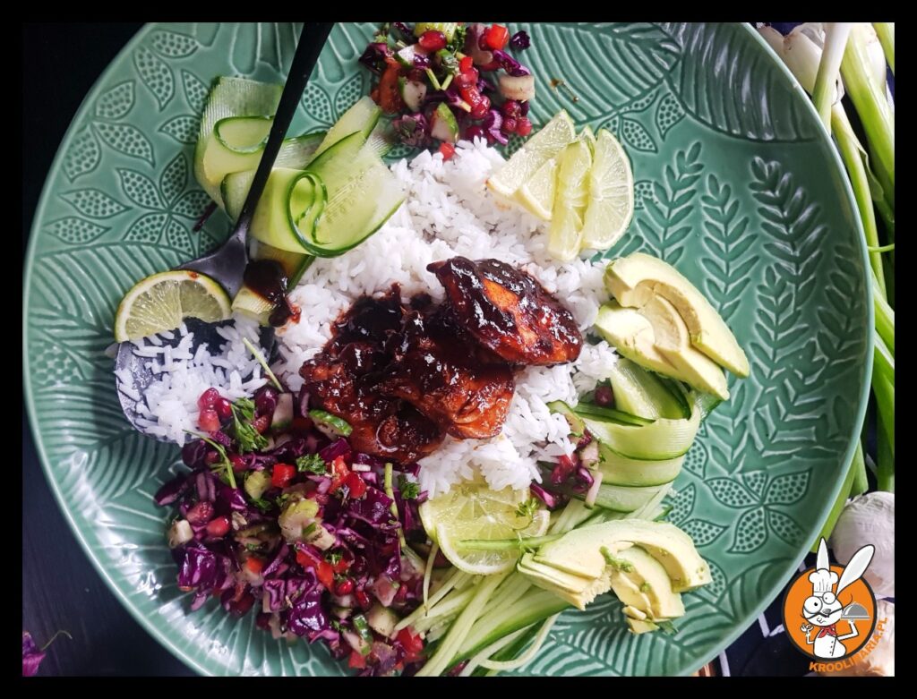 1. Wymieszać wszystkie składniki glazury w średniej misce. Kurczaka umieścić w misce i wstawić do lodówki na kilka godzin lub na całą noc. Na patelni z gorącym tłuszczem podsmazyć kawałki kurczaka wyciągnietego z glazury. Po przesmażeniu kurczaka z obu stron dodać resztę glazury i dusić do miękkości mięsa. Podawać z ryżem i warzywami. U mnie jest to sałatka z czerwonej kapusty, czerwonej papryki, granatu, selera naciowego i zielonego ogórka.