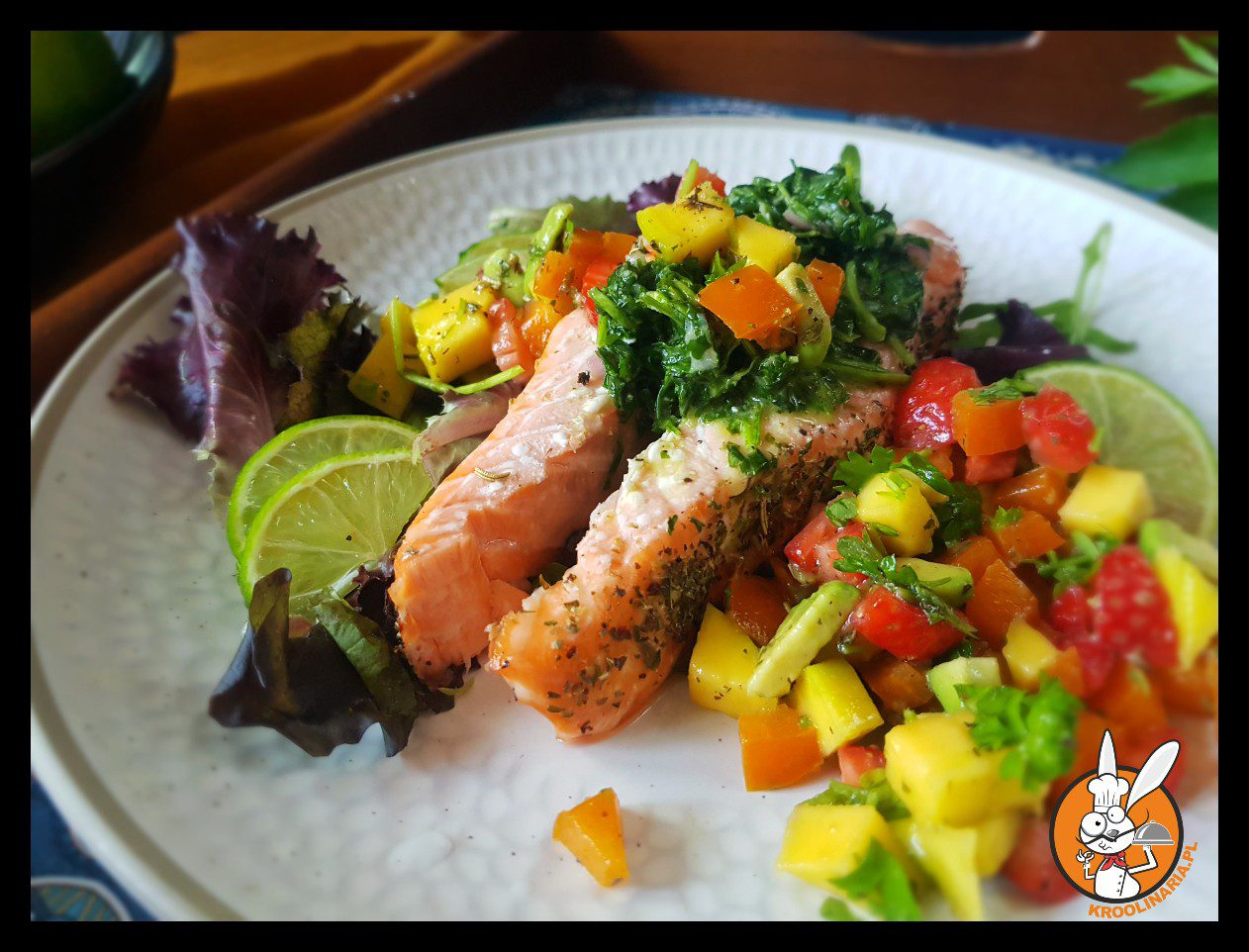 Króliś (doświadczalny) poleca: Łosoś z sosem chimichurri i sałatką z mango