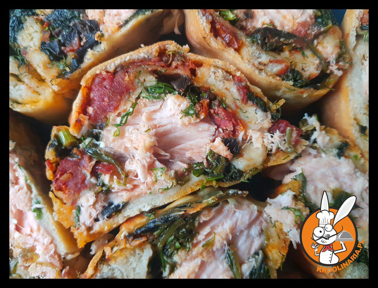 Łosoś z nadzieniem z oliwek, szpinaku, suszonych pomidorów zawinięty w ciasto od pizzy.Nawet Konefka nie bardzo przepadająca za rybami w takiej postaci spałaszowała i przeżyła. Znaczy spokojnie możecie robić i jeść. Przetestowane i obyło się bez ofiar w ludziach