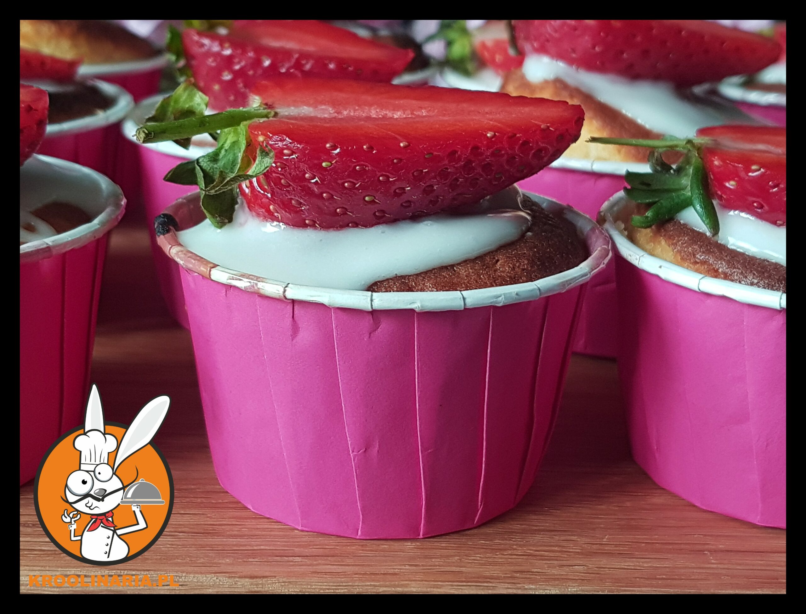 - Ciasto nakładać łyżką do lodów do papilotek ( U mnie są to papilotki: 7 cm średnica i 4 cm wysokość. Z tej ilości ciasta przy takich papilotkach wyszło mi 20 muffinek). Do każdej papilotki, na środek włożyć 1 truskawkę.Muffinki wstawic do piekarnika nagrzanego do 180 C na ok 25 minut. Po upieczeniu wystudzić, udekorować lukrem i truskawkami
