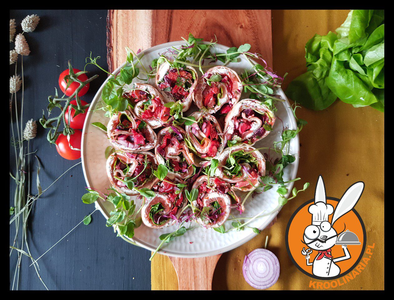 - Naleśnik posmarować serkiem, nałożyć sałatę i plastry łososia. na wierzch nałożyć sałatkę. Zwinąć ciasno w rulon i pokroić na kawałki