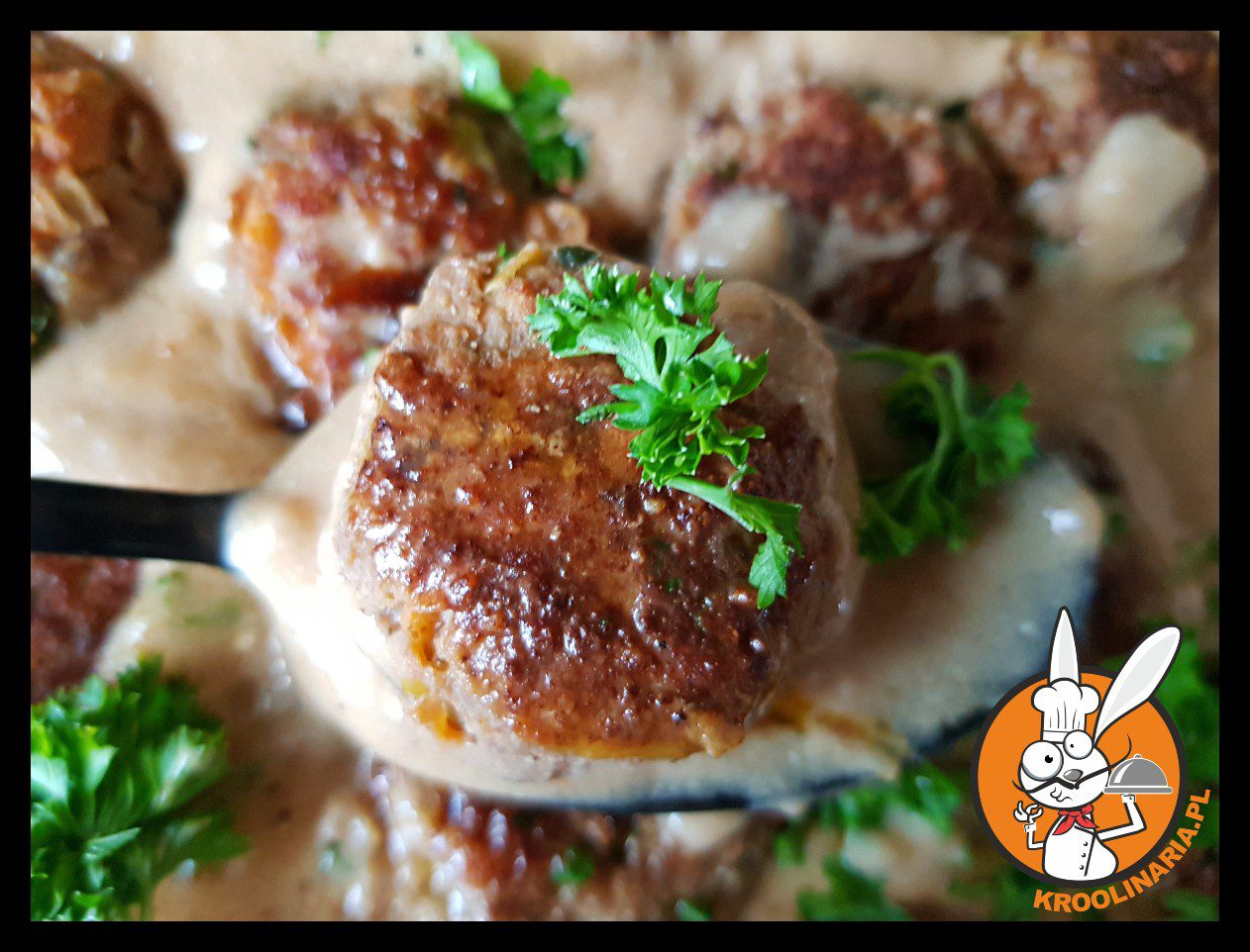 - Roztopić masło na dużej patelni. Dodać mąkę do masła i dobrze wymieszać. Smażyć do zrumienienia. Dodać bulion wołowy, bulion drobiowy, śmietanę, śmietanę, sos sojowy, musztardę Dijon, sos Worcestershire, ocet jabłkowy, cukier i czarny pieprz. W razie potrzeby doprawić solą. Zagotować na średnim ogniu, następnie zmniejszyć ogień do małego i dodać klopsiki. Dusić, delikatnie i często mieszając, aż sos zgęstnieje. Dodać posiekaną natkę pietruszki i delikatnie wymieszać