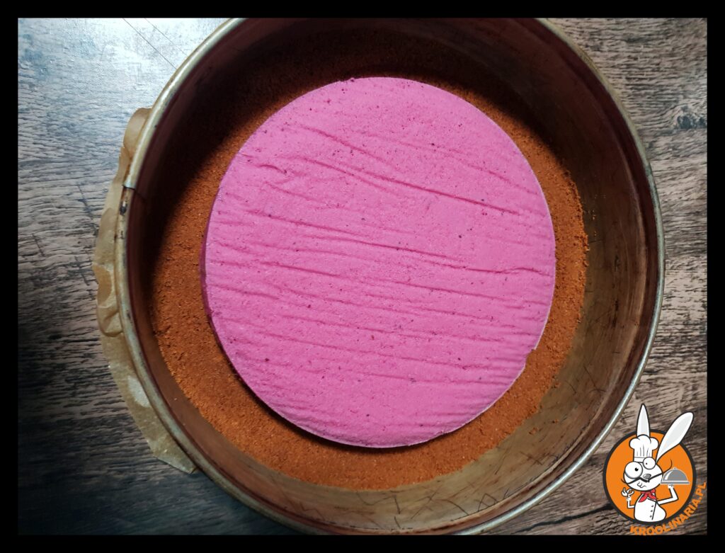 - Ciasteczka zmielić w blenderze na piaskową masę, następnie dodać roztopione masło i jeszcze raz zmiksować. Masą ciasteczkową wyłożyć dno tortownicy (25 cm). Mocno uklepać i docisnąć. Wstawić do lodówki i schłodzić przez pół godziny w lodówce