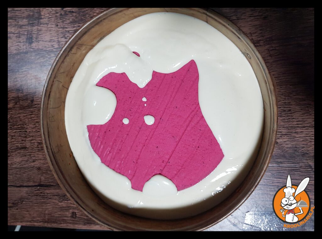 - Żelatynę dodać do masy żurawinowej, dobrze wymieszać i odstawić do ochłodzenia. Białka ubić na sztywno. Pod koniec ubijania wsypywać po łyżce cukier cały czas ubijając do uzyskania gęstej masy białkowej. Ubite białka delikatnie wmieszać szpatułką do masy. Delikatnie ale dobrze połączyć. Żurawinowy mus wylać do połowy wysokości tortownicy o srednicy 19cm. Wsadzić do lodówki, do stężenia. Tak przygotowany mus wyciagnąć z tortownicy i umieścić w tortownicy o średnicy 25 cm, na środku ciasteczkowego spodu. Pozostały mus zurawinowy, jesli zostanie można wylać do dowolnej foremki silikonowej i wykorzystac potem jako dekorację ciasta