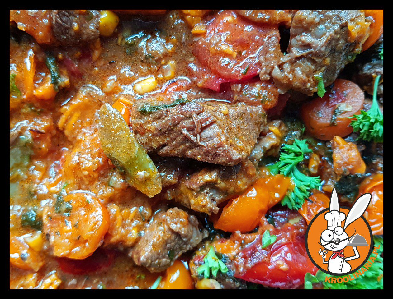 - Rozgrzać olej w dużym rondlu i smażyć mięso na dużym ogniu, aż ładnie się zarumieni. Dodać bulion i dusić 60 min. Po tym czasie dodać czosnek i jarmuż. Gotować kolejne 30 min. Po tym czasie dodać marchew, batata, suszone pomidory, cukinię i kukurydzę. Dusić kolejne 30 min aż warzywa będą miękkie. Pod koniec dodać sos worcestershire.