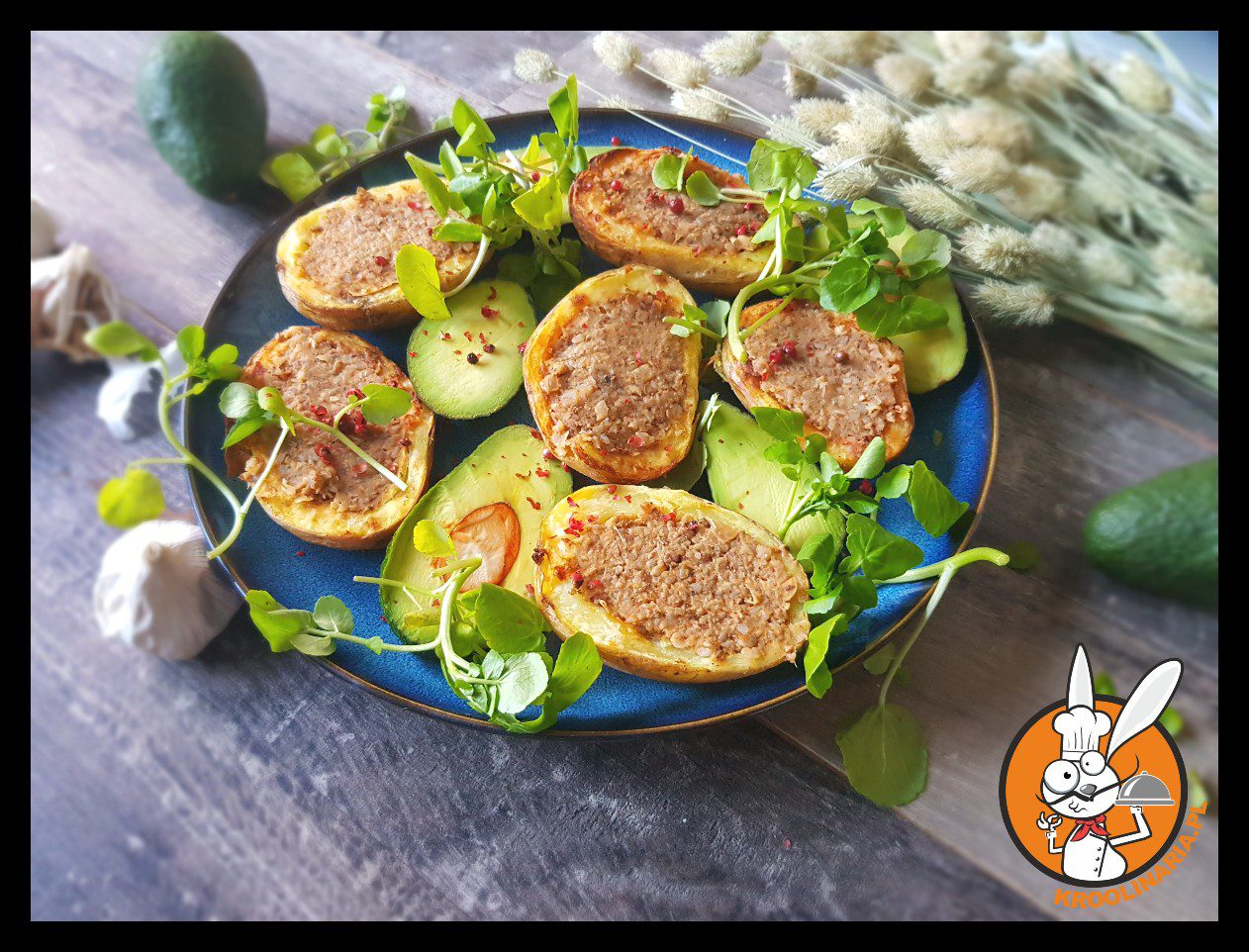 Przepis na: ziemniaki nadziewane pastą fasolowo gryczaną. Kolejne danie z serii: i żyli długo i szczęśliwie. No dobra trochę to koloryzowane, ale trzeba sobie czasem pokoloryzować życie, zwłaszcza jak się mieszka z Królisiem (doświadczalnym). No ale żyli dłużej, a to zasługa zdrowego jedzenia. Zasługa też tego, że skoro nie było mięska, to Króliś (doświadczalny) mniej sie przypierdzielał. A ponieważ sie mniej przypierdzielał to nie dostał żeliwną patelenką w czerep i zachował swoje królicze życie…
